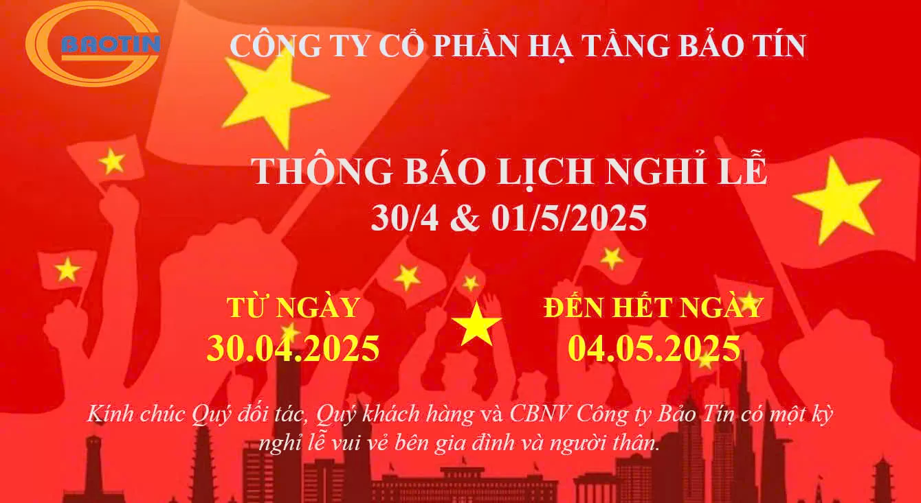 Công ty cổ phần Hạ tầng Bảo Tín thông báo lịch nghỉ Lễ ngày Giải phòng Miền Nam 30/4 và ngày Quốc Tế Lao Động 01/5/2025 như sau: